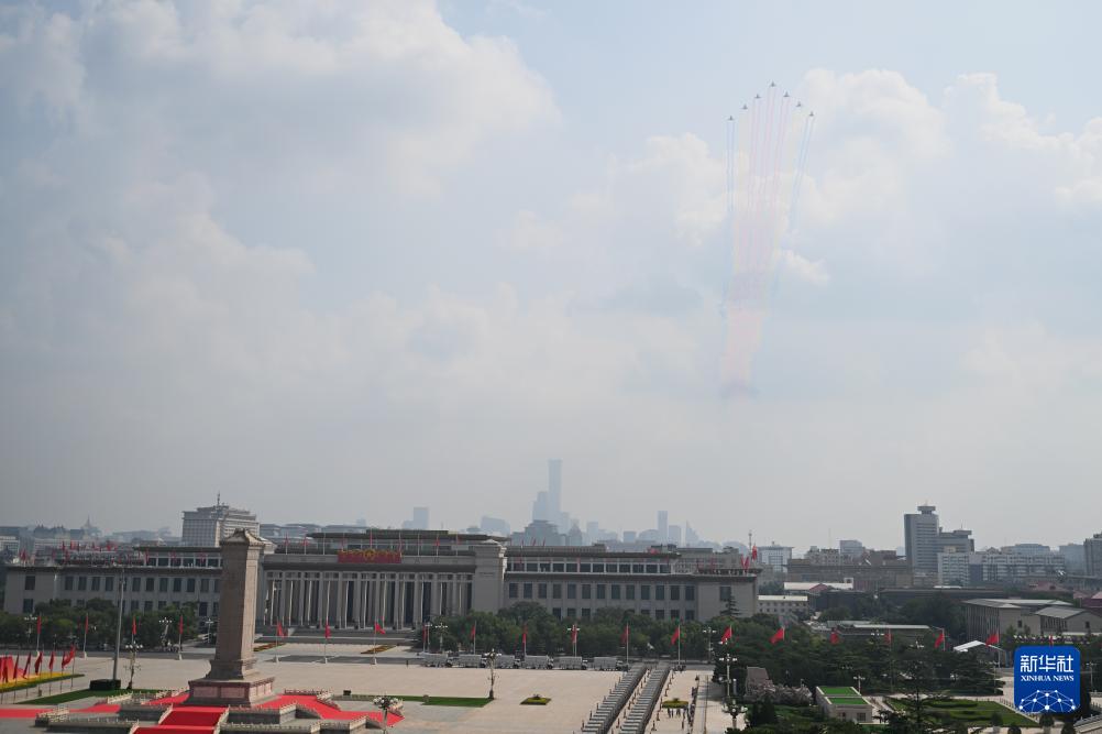 9月3日,纪念中国人民抗日战争暨世界反法西斯战争胜利80周年大会在北京隆重举行。这是教练机梯队飞过天安门广场上空。