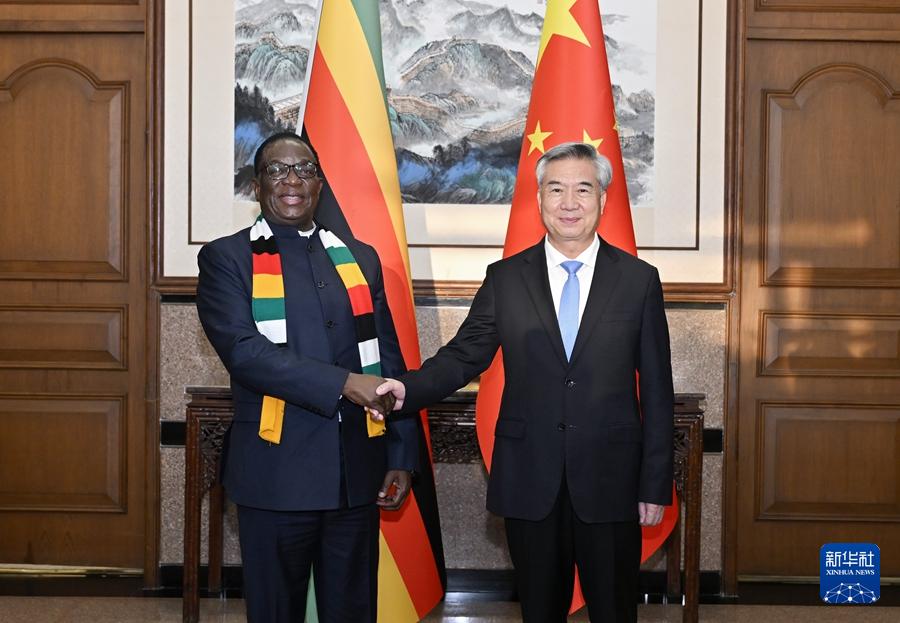 9月4日,中共中央政治局常委、中央纪委书记李希在北京会见来华出席纪念中国人民抗日战争暨世界反法西斯战争胜利80周年活动的津巴布韦总统姆南加古瓦。新华社记者 岳月伟 摄