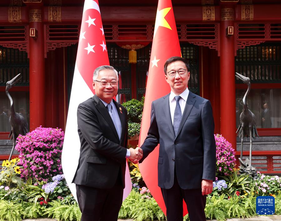 9月4日,国家副主席韩正在北京会见来华出席纪念中国人民抗日战争暨世界反法西斯战争胜利80周年活动的新加坡副总理兼贸工部长颜金勇。新华社记者 庞兴雷 摄