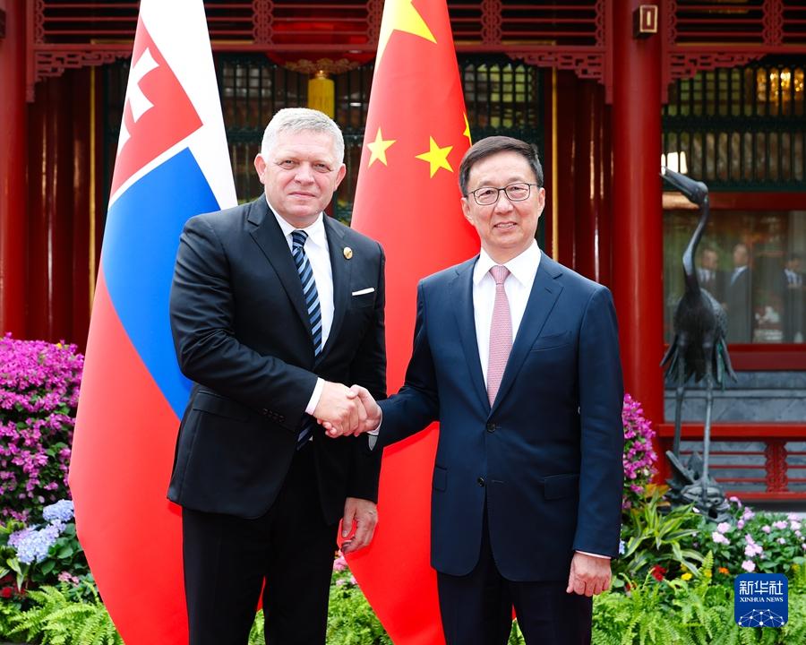 9月4日,国家副主席韩正在北京会见来华出席纪念中国人民抗日战争暨世界反法西斯战争胜利80周年活动的斯洛伐克总理菲佐。新华社记者 刘彬 摄