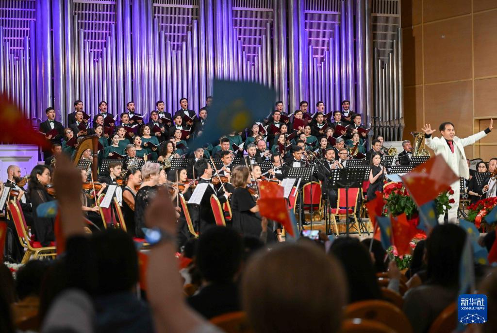 纪念中国人民抗日战争暨世界反法西斯战争胜利80周年、纪念冼星海诞辰120周年音乐会3日晚在哈萨克斯坦阿拉木图的国立江布尔音乐厅举行。阿市政府、外交领事机构、老兵协会、当地华侨华人、中资机构、留学生等各界人士近600人出席。哈国立拜卡达莫夫合唱团、阿布德拉舍夫国立模范交响乐队共同演绎《黄河大合唱》《阿曼盖尔德》等作品。观众们自发挥舞中哈两国国旗,齐声高唱歌曲,现场气氛澎湃激昂。
