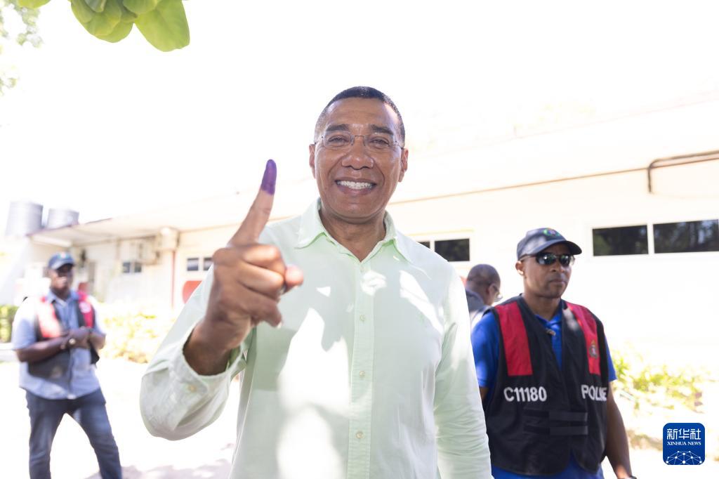 9月3日,在牙买加首都金斯敦一处投票站,牙买加执政党牙买加工党党首安德鲁·霍尔尼斯在投票后展示手指上的墨水。
