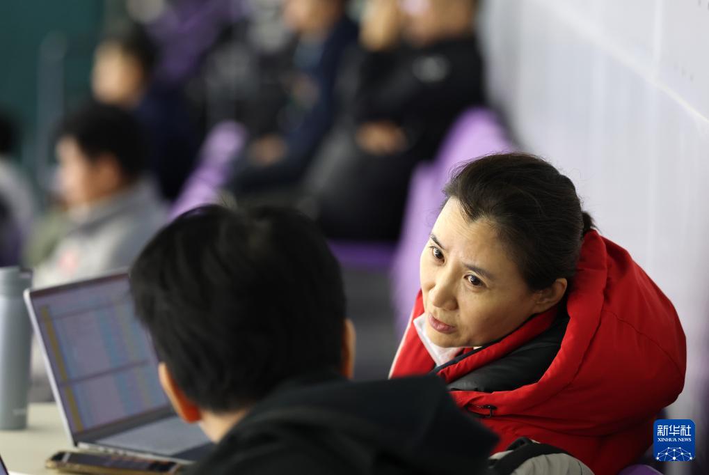 9月4日,中国短道速滑队主教练张晶(右)观看比赛时与助手交流。