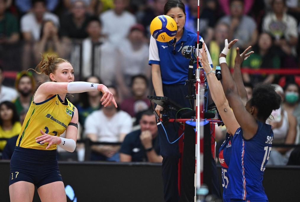 巴西队在小组赛中曾以3:2险胜法国队,这次她们以27:25、33:31和25:19胜出。前两局的争夺异常激烈,第二局更是一波三折。法国队一度取得19:15的优势,却被巴西队连得4分追成19平。此后,巴西队以24:22率先拿到局点,却被法国队连得3分以25:24反超。领先几度易手、双方又多次错过局点之后,比分来到31平。关键时刻,库迪耶斯扣球成功,接下来加比在反击中推攻得分,帮助巴西队以33:31险胜。