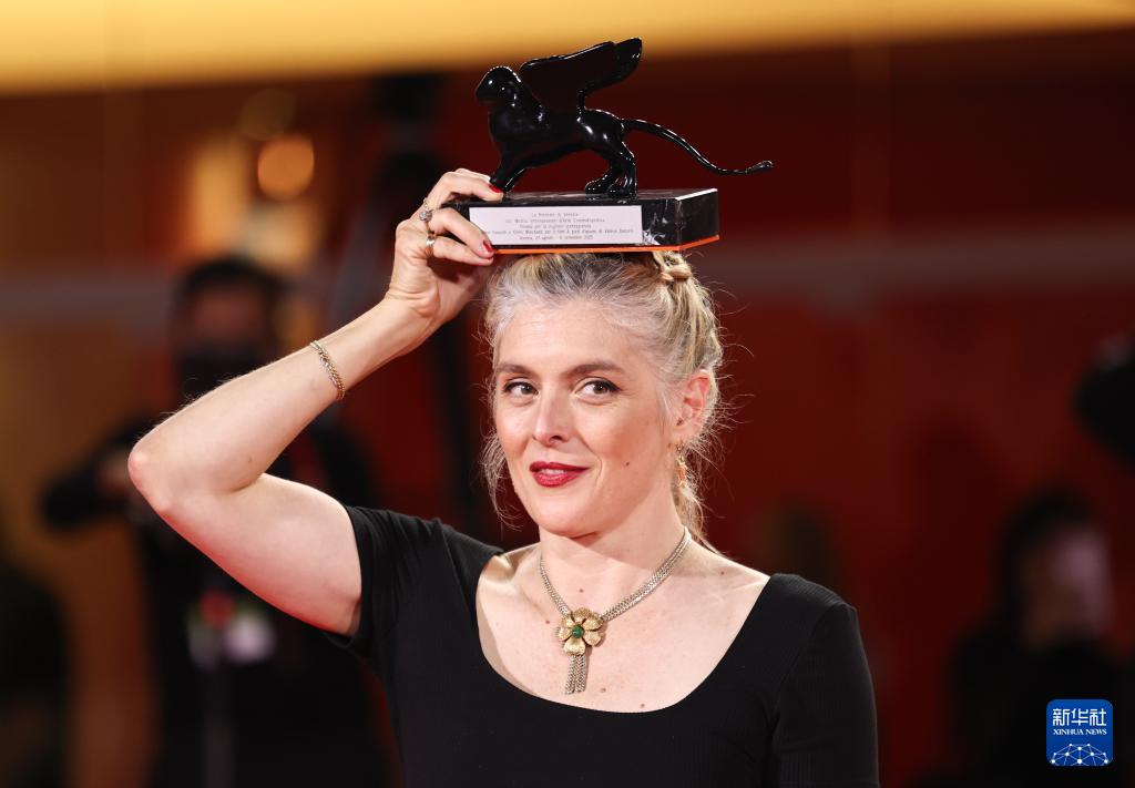 9月6日,在意大利威尼斯,最佳剧本奖获得者、电影《执笔》导演瓦莱丽·唐泽利与奖杯合影。