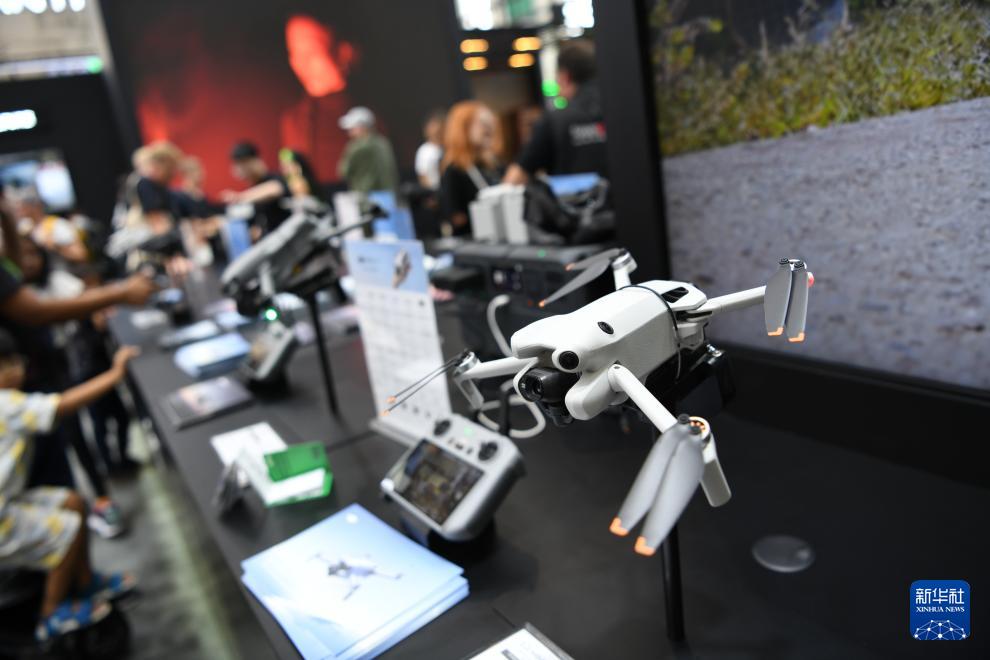 这是9月6日在德国柏林国际消费电子展大疆展区拍摄的无人机。