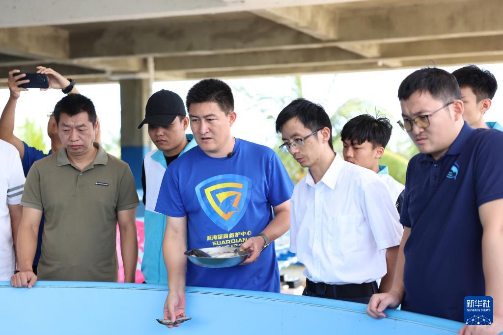 9月8日,在海南陵水,志愿者在观察海豚“万万”的情况。