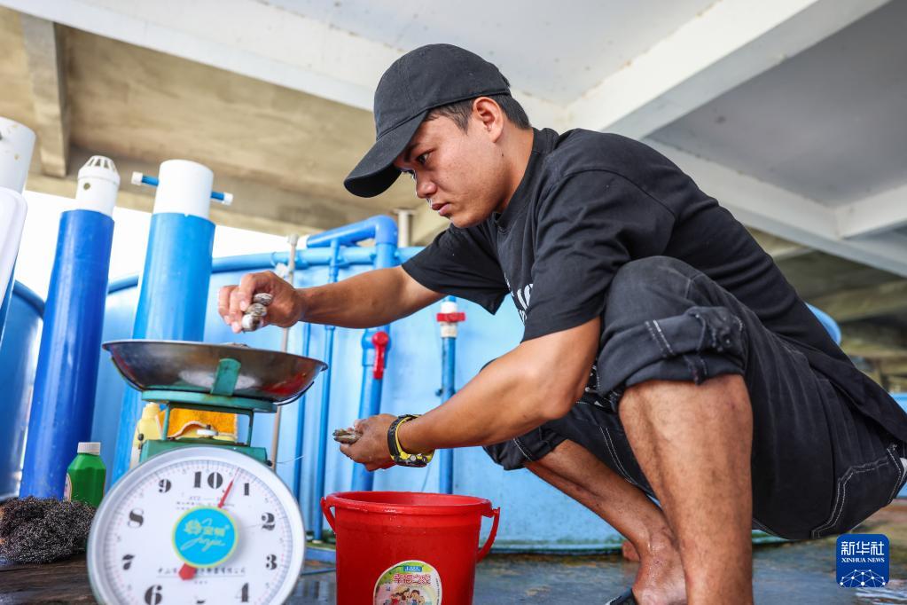 9月8日,在海南陵水,救助人员在给海豚“万万”的食物称重。