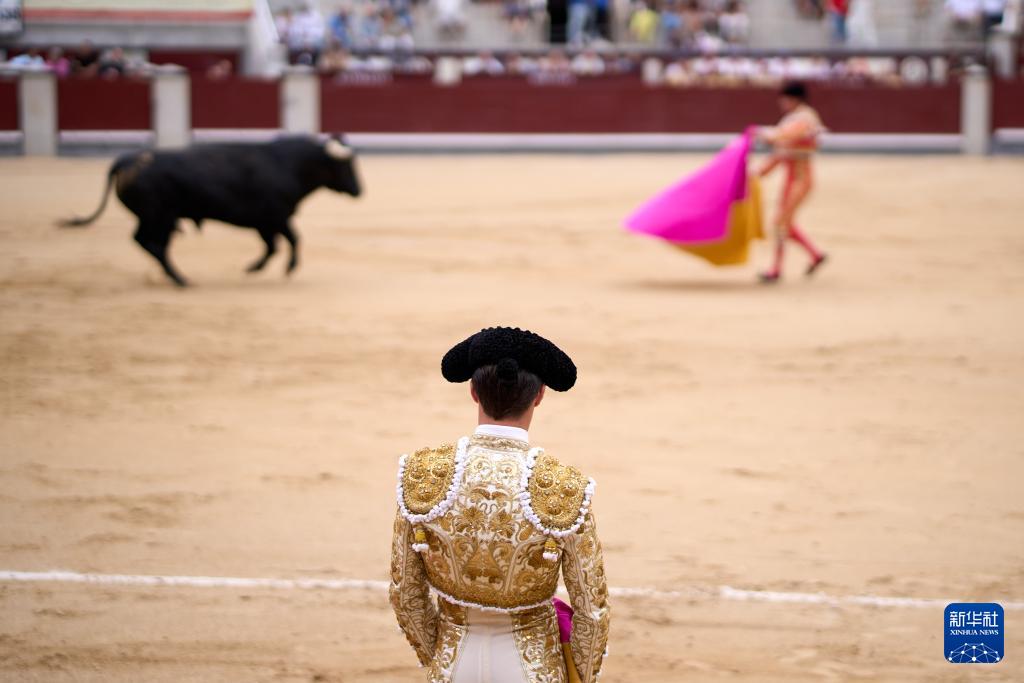 9月7日,一名斗牛士在西班牙马德里拉斯本塔斯斗牛场内观看斗牛表演。