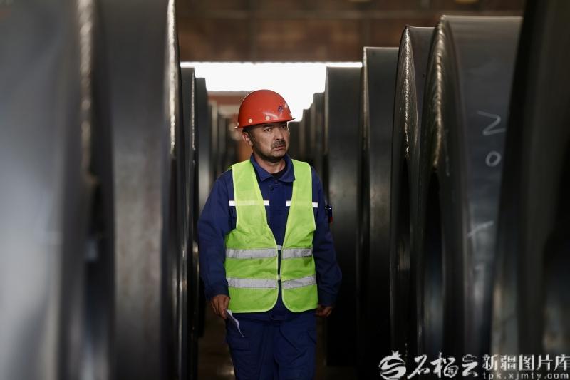 9月8日,新疆八一钢铁集团有限公司冷轧车间,工作人员正在查看生产的冷轧钢卷。