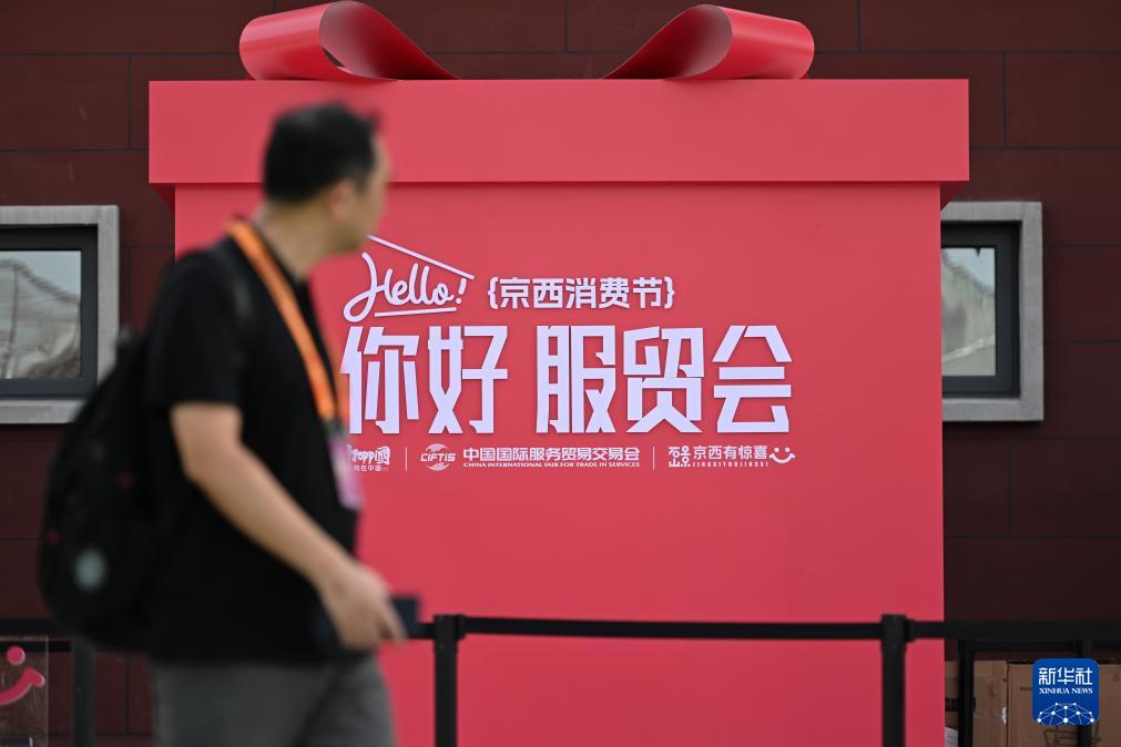 9月9日,在首钢园,一名男子经过写有“你好服贸会”的装置。