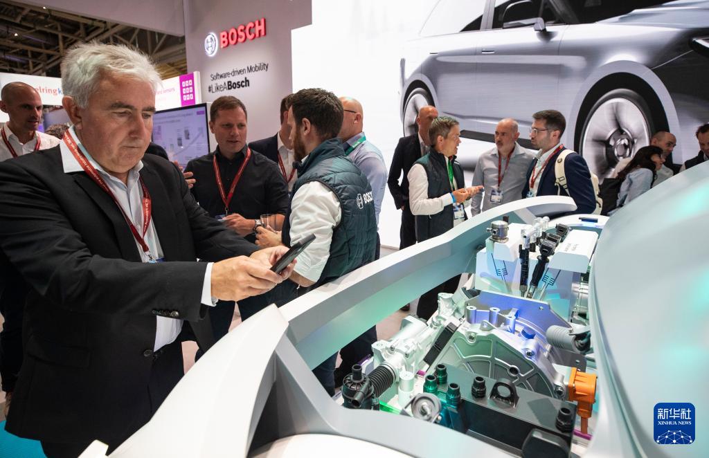 9月9日,一名男子在德国慕尼黑国际车展的博世展台参观拍照。