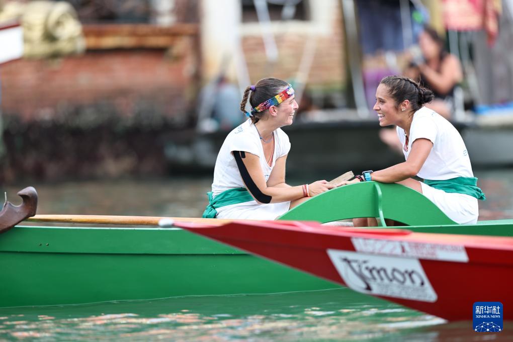 9月7日,在意大利威尼斯,“划行威尼斯”成员埃莱娜·阿尔曼西(左)与队友获得传统赛船节成年女子组第三名后庆祝。