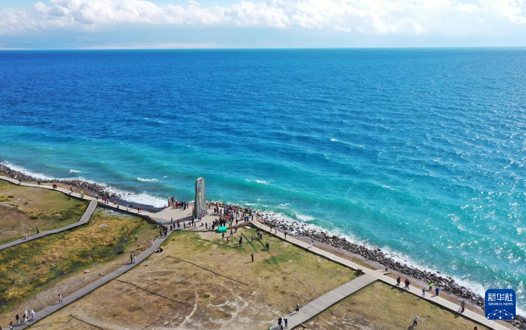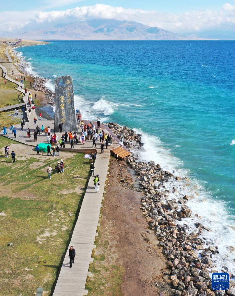 9月11日,游客在赛里木湖景区游览(无人机照片)。