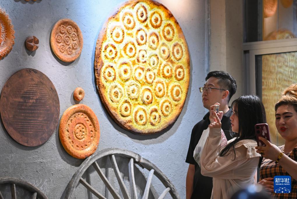 9月9日,在乌鲁木齐的大巴扎馕主题馆,游客观看库车大馕及其他馕品的仿真展品。