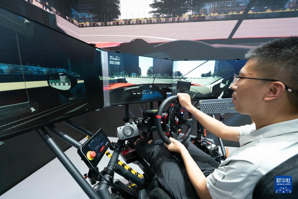 9月11日,参观者在体验六自由度赛车模拟器。