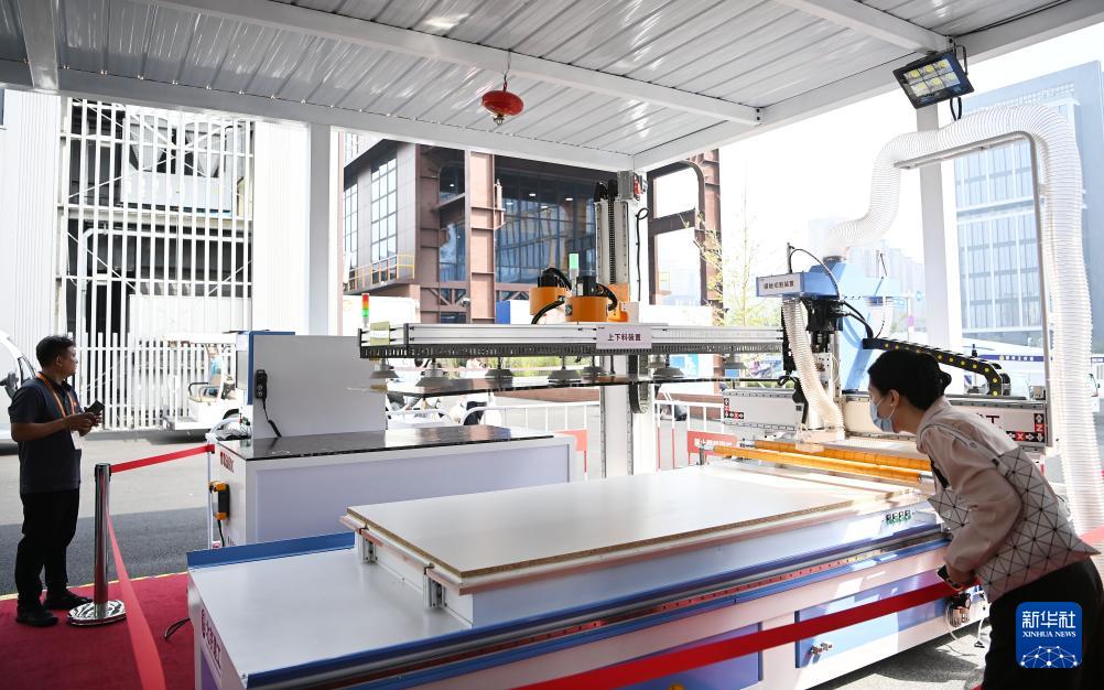 9月11日,在服贸会工程咨询与建筑服务专题展区,参观者(右)在北京建工展台参观智能模板无人工厂。