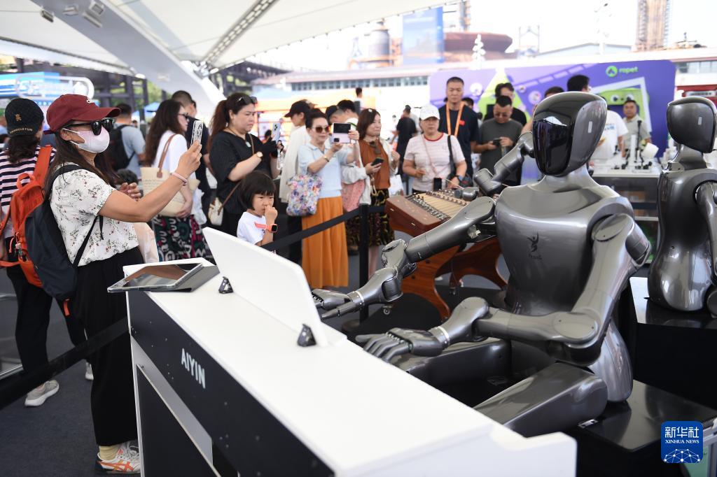 9月11日,参展者在服贸会拍摄弹钢琴的人形机器人。
