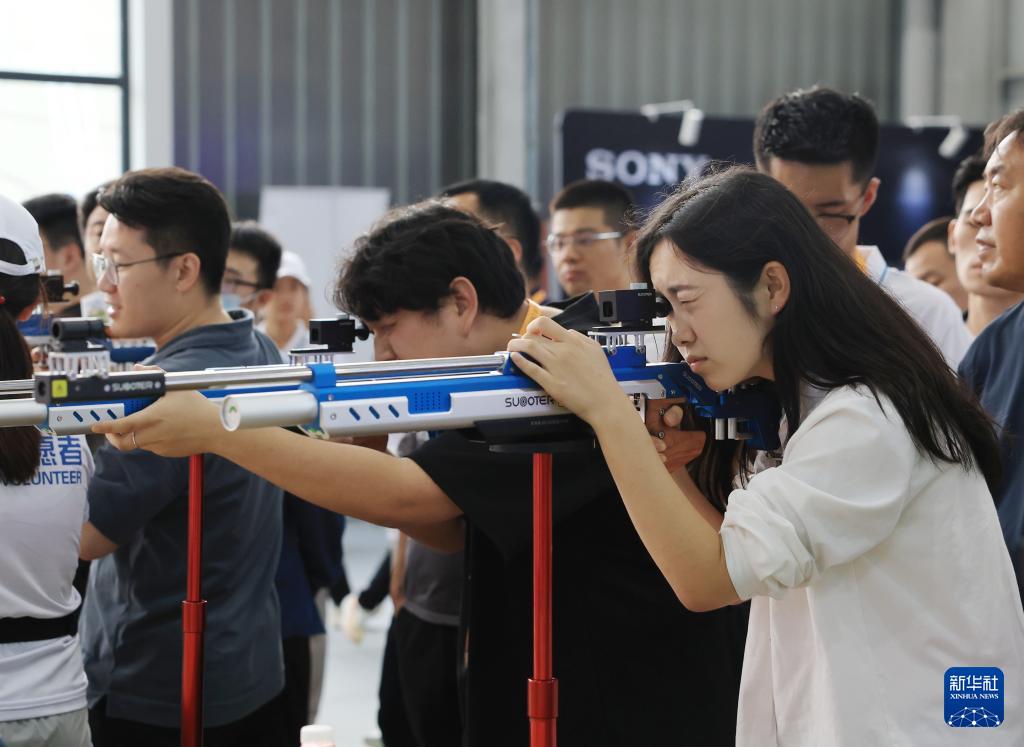 9月11日,参观者在体育服务专题展区体验激光射击。