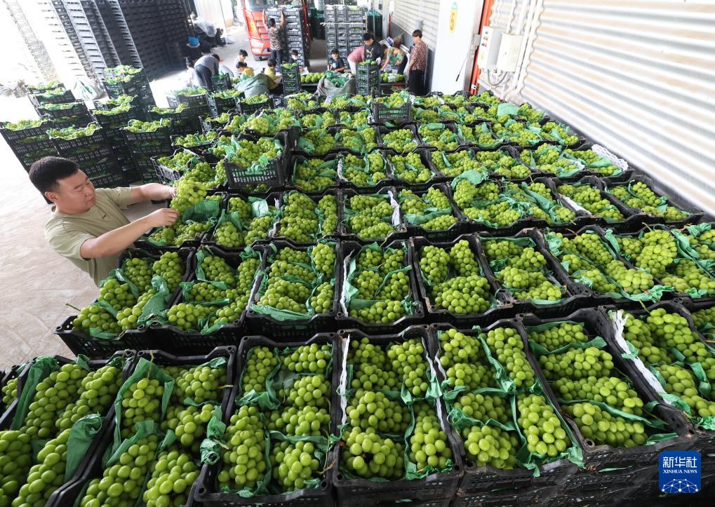 9月11日,在河北省晋州市桃园镇周头村一家葡萄种植基地,农民将采收的葡萄分拣装箱。