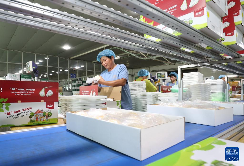 9月11日,河北省晋州市一家梨果出口企业的工人将梨果装箱。