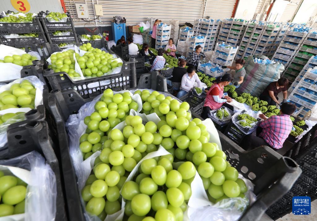 9月11日,在河北省晋州市桃园镇周头村一家葡萄种植基地,农民将采收的葡萄分拣装箱。