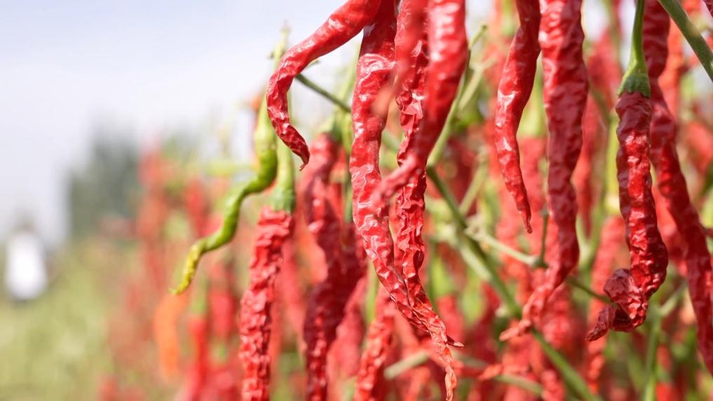 眼下,新疆巴音郭楞蒙古自治州焉耆县的14万亩工业辣椒进入采收季,种植户抢抓晴好天气采摘辣椒。