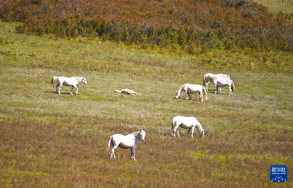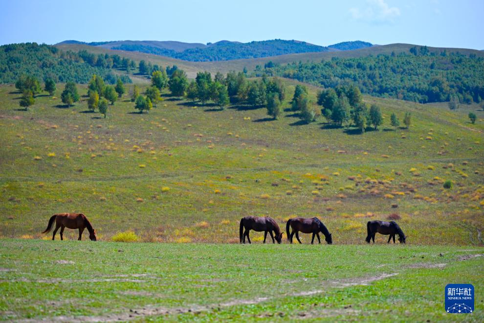 9月12日,马匹在乌兰布统草原上觅食。