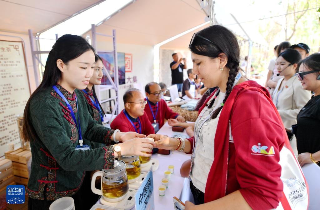 9月14日,外国游客在石家庄市元氏县了解中医药文化。