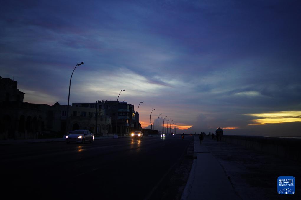 这是9月10日傍晚在古巴首都哈瓦那拍摄的停电后的海滨大道。
