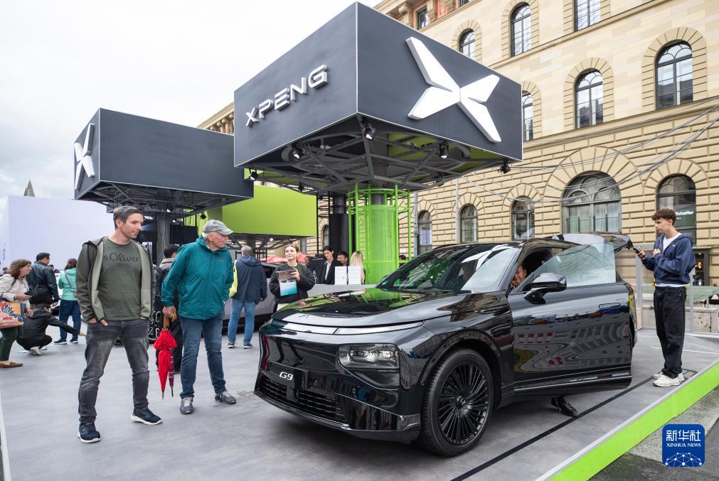 9月9日,人们在德国慕尼黑国际车展户外展区的小鹏汽车展台参观。