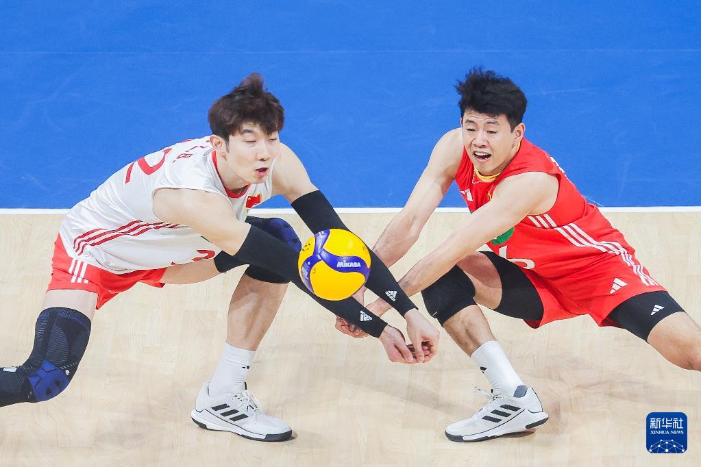 9月18日,中国队球员曲宗帅(右)、刘力宾在比赛中垫球。