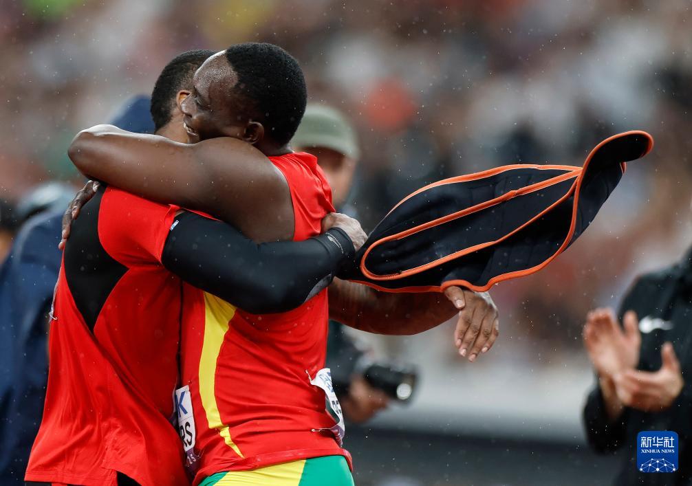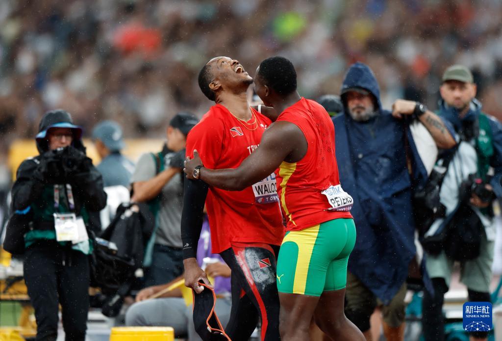 9月18日,冠军特立尼达和多巴哥选手沃尔科特(左)和亚军格林纳达选手彼得斯在赛后拥抱。