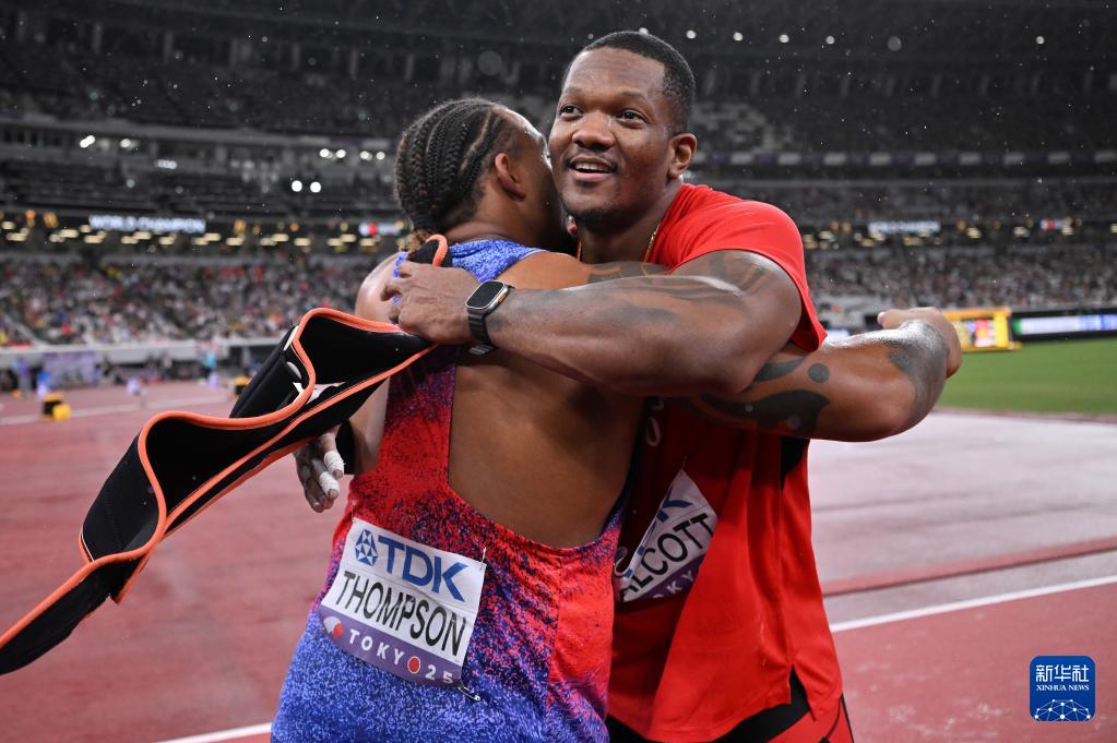 9月18日,冠军特立尼达和多巴哥选手沃尔科特(右)和季军美国选手汤普森在比赛后拥抱。