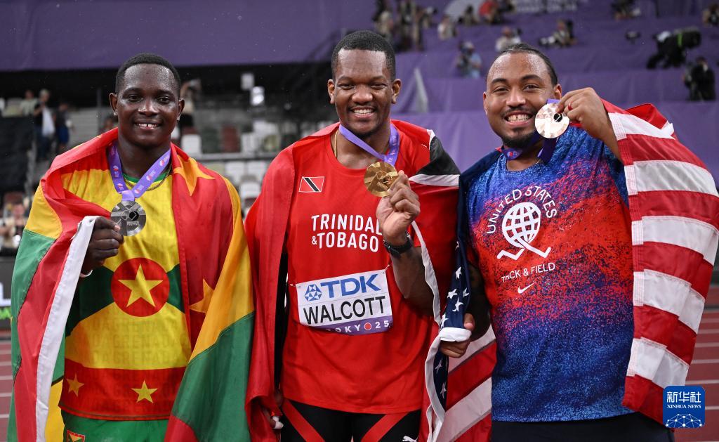 9月18日,冠军特立尼达和多巴哥选手沃尔科特(中),亚军格林纳达选手彼得斯(左)和季军美国选手汤普森在比赛后合影。