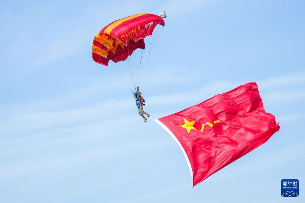 9月19日,空军航空大学“蓝鹰”跳伞队进行表演。
