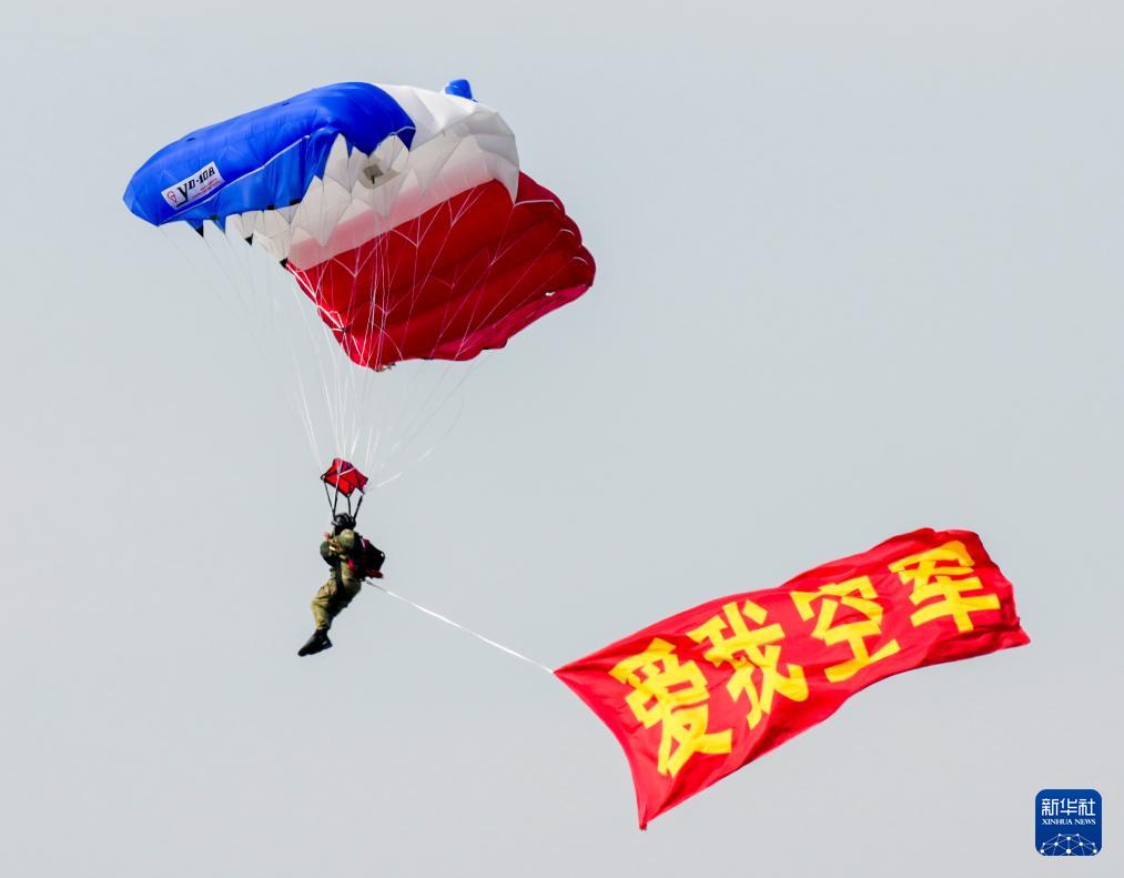 9月19日,2025年空军航空开放活动和长春航空展上,空军航空大学“蓝鹰”跳伞队进行表演。