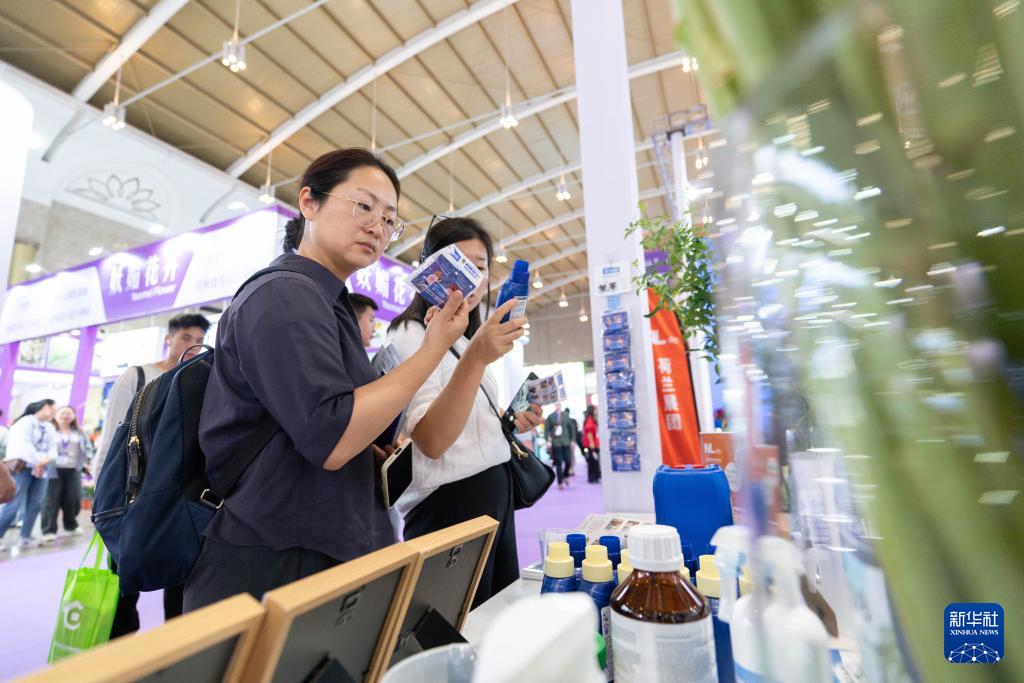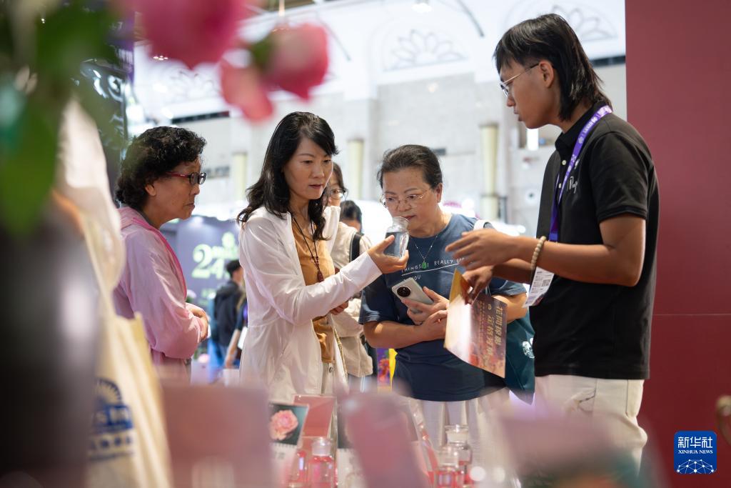 9月19日,观众在第二十三届中国昆明国际花卉展了解鲜花纯露。
