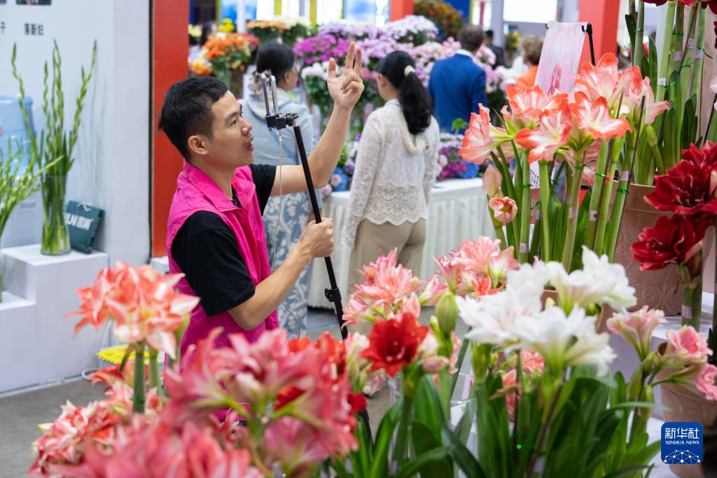 9月19日,参展商在第二十三届中国昆明国际花卉展直播推介花卉。