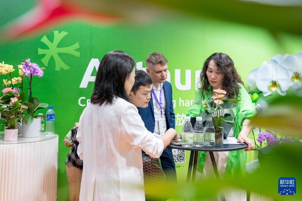 9月19日,参展商在第二十三届中国昆明国际花卉展洽谈业务。