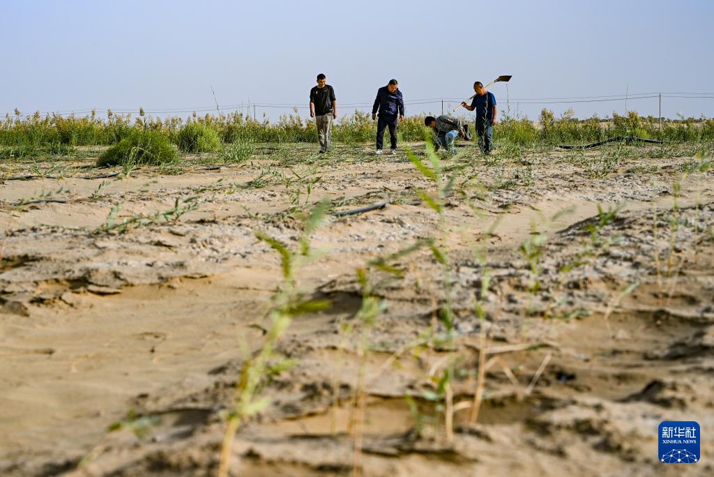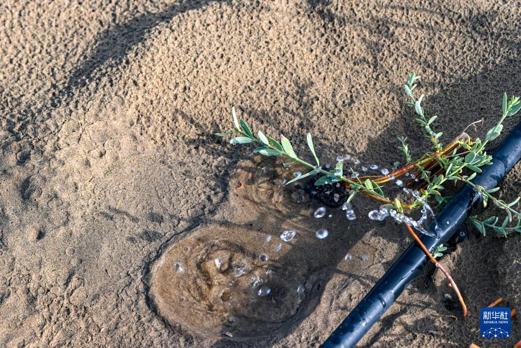 9月20日,在新疆尉犁县境内的塔里木河南岸防沙治沙区,工作人员查看滴灌管情况。