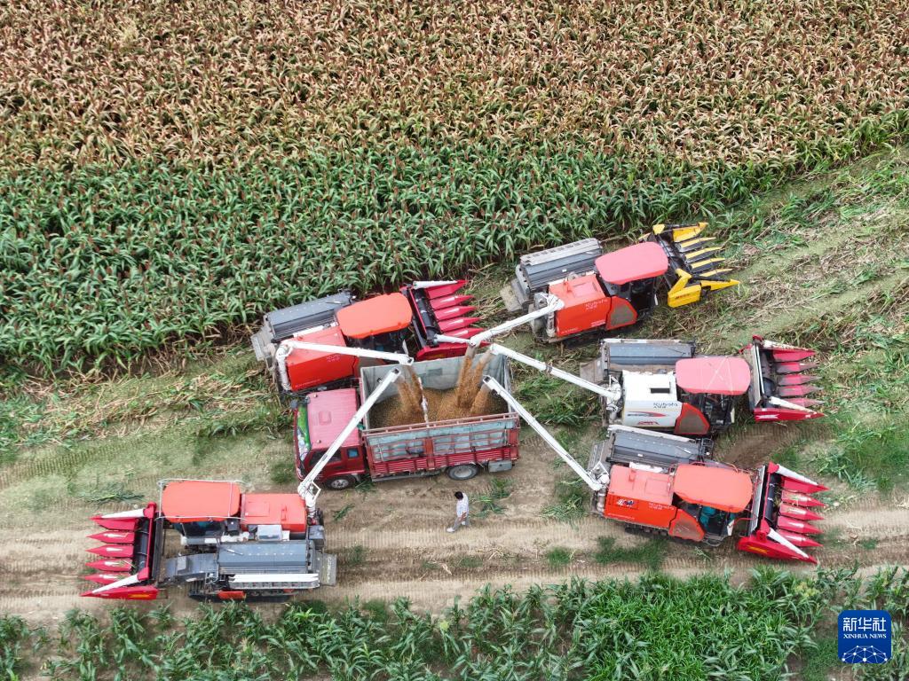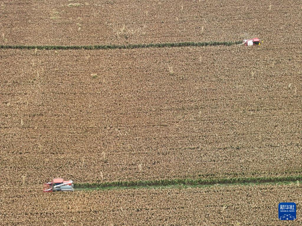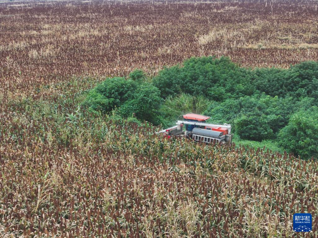 9月21日,收割机在地里收割高粱(无人机照片)。