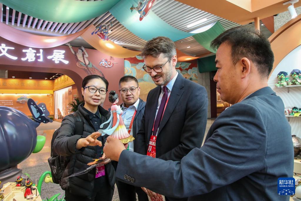 9月21日,与会嘉宾在第八届丝绸之路(敦煌)国际文化博览会上参观应用3D打印技术打印的文创产品。
