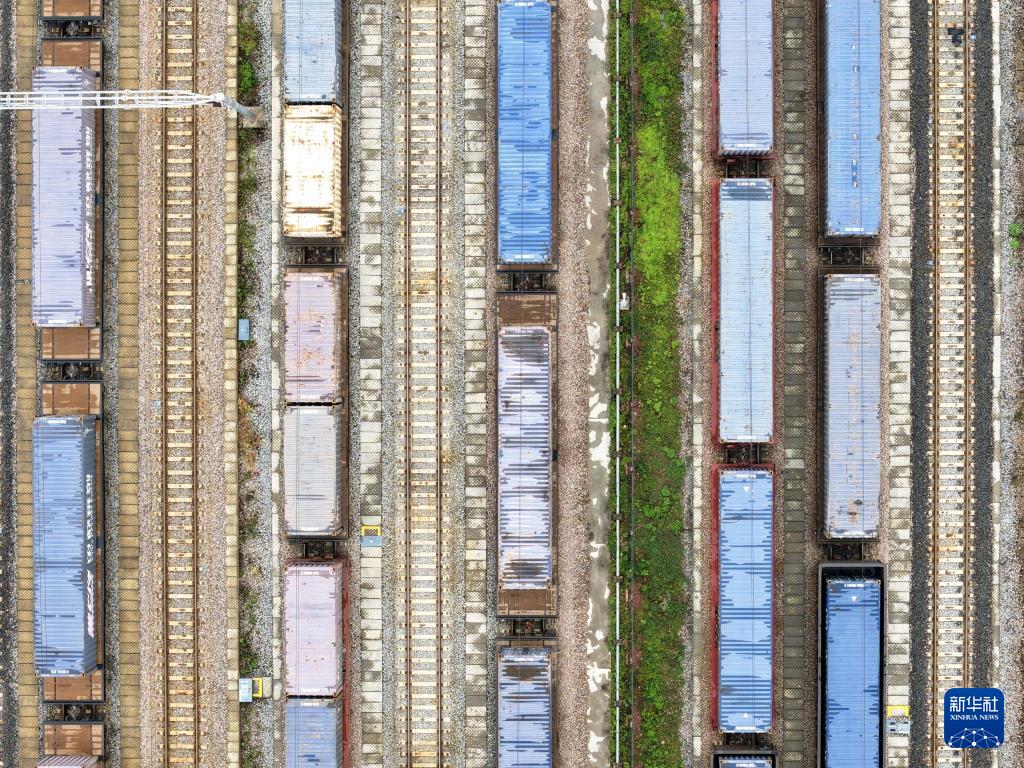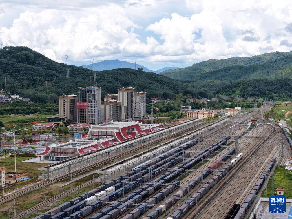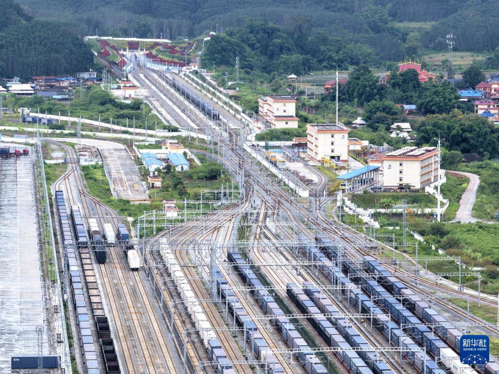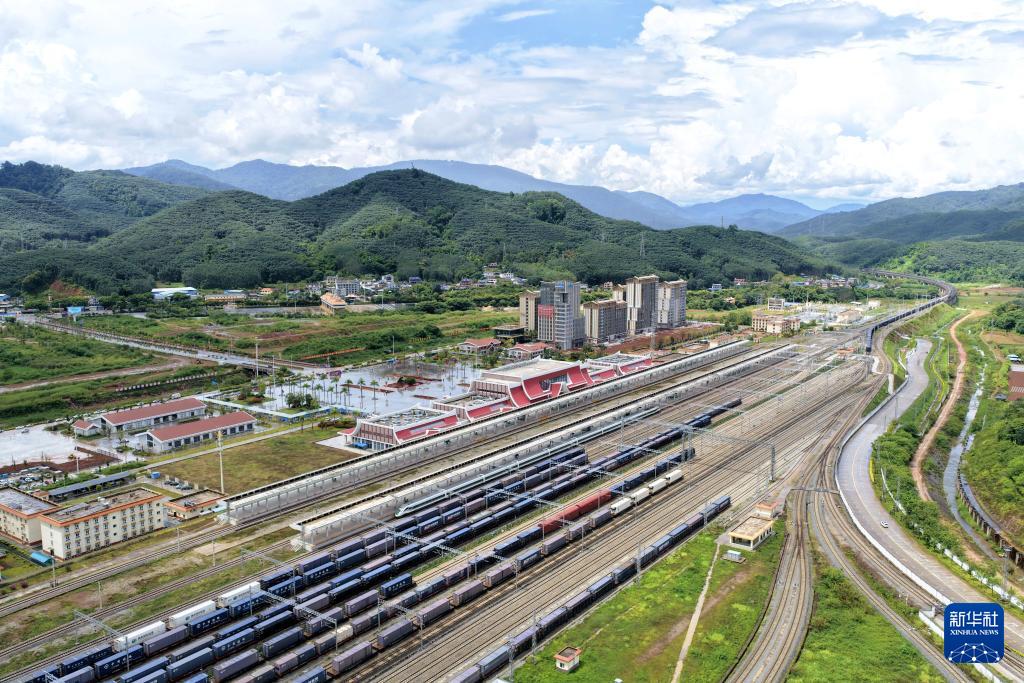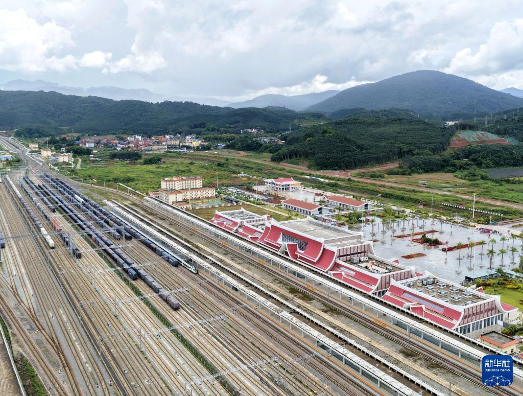 9月21日,中老铁路上的货运列车在磨憨站通过(无人机照片)。