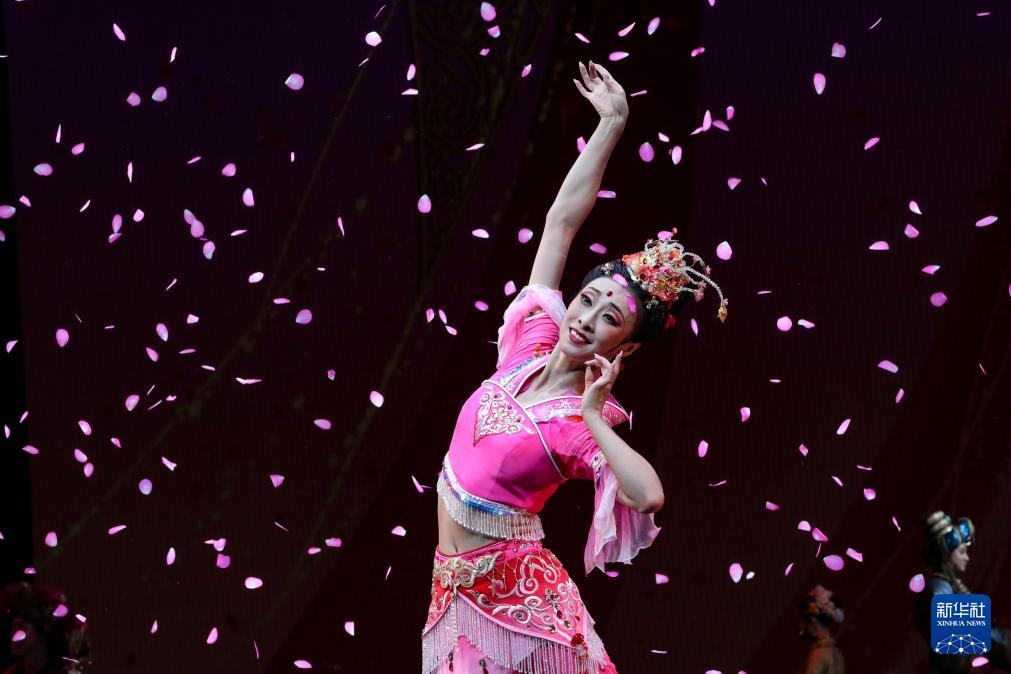 9月20日晚,演员在敦煌大剧院表演新版《丝路花雨》,展示经典舞姿“反弹琵琶”。
