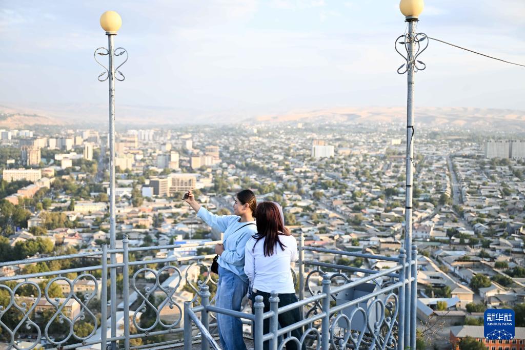 9月19日,在吉尔吉斯斯坦奥什,游客在苏莱曼山拍照。