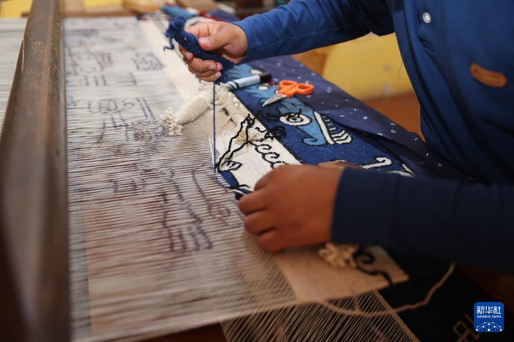 9月17日,在墨西哥瓦哈卡州特奥蒂特兰-德尔巴列市一家纺织工坊,手工艺人用踏板织机纺织羊毛毯。