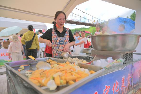 逛在烟火里。主会场20个“好物云集·村集”摊位烟火升腾,米糕、擂茶让“吃货”排起长队,河龙贡米等特色农产品更被争先抢购,乡村市集变身“爆款制造机”。