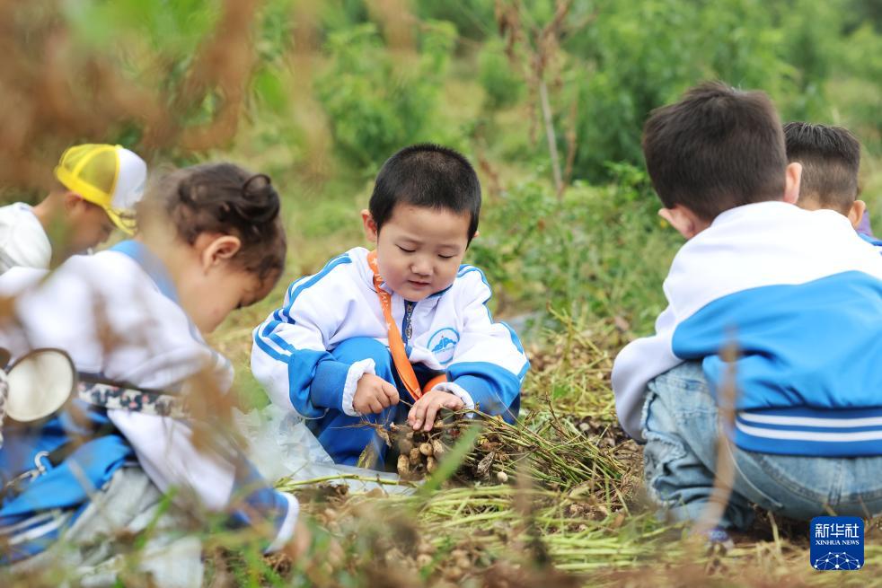 9月23日,河北省迁安市组织150余名幼儿园儿童来到亚滦湾农业公园开展研学活动。这是小朋友在亚滦湾农业公园采摘花生。