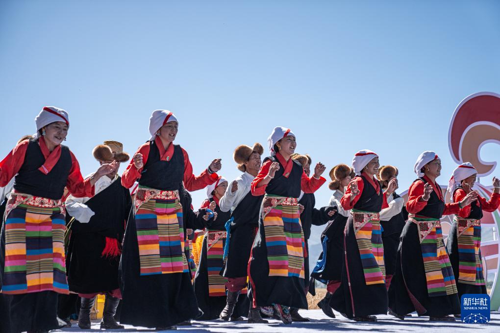 9月23日,在西藏拉萨市林周县强嘎乡典冲村,当地农牧民群众载歌载舞迎丰收。